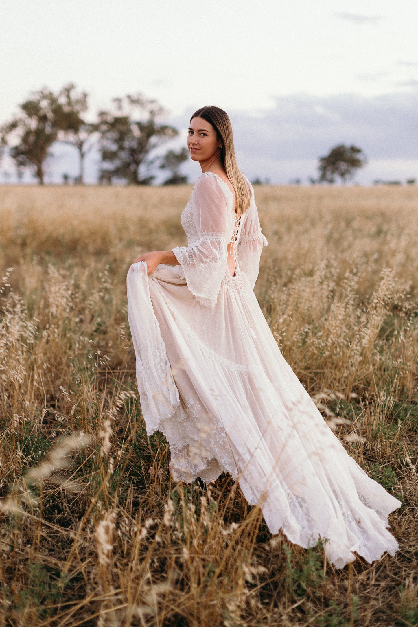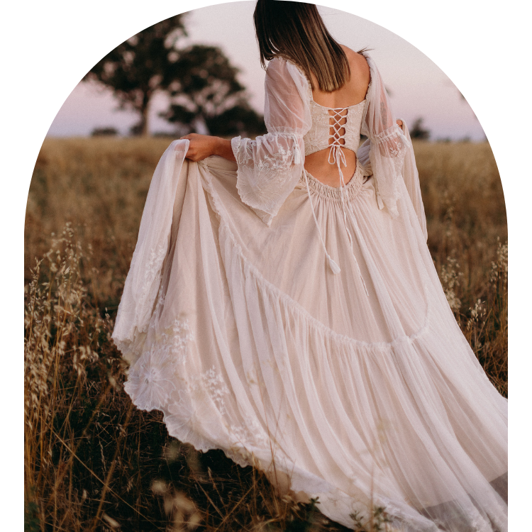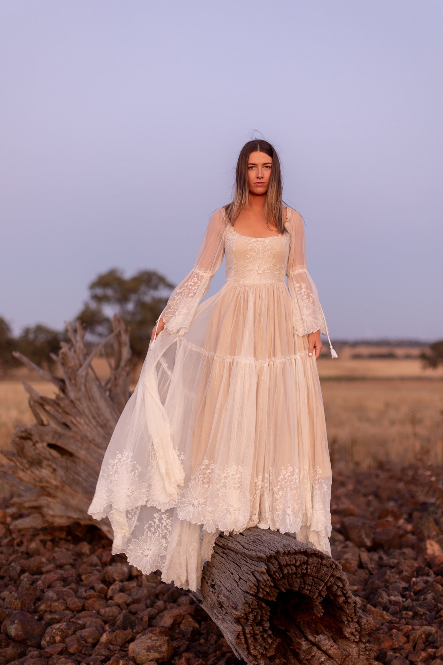The floral lace detailing on the bust is simply breath-taking, adding a touch of vintage-inspired beauty. The sheer sleeves can be gathered and tied at the elbows, flowing gracefully to create that dreamy, whimsical vibe. Whether you wear them loose or styled at the elbow, they add a touch of ethereal magic to your look.
