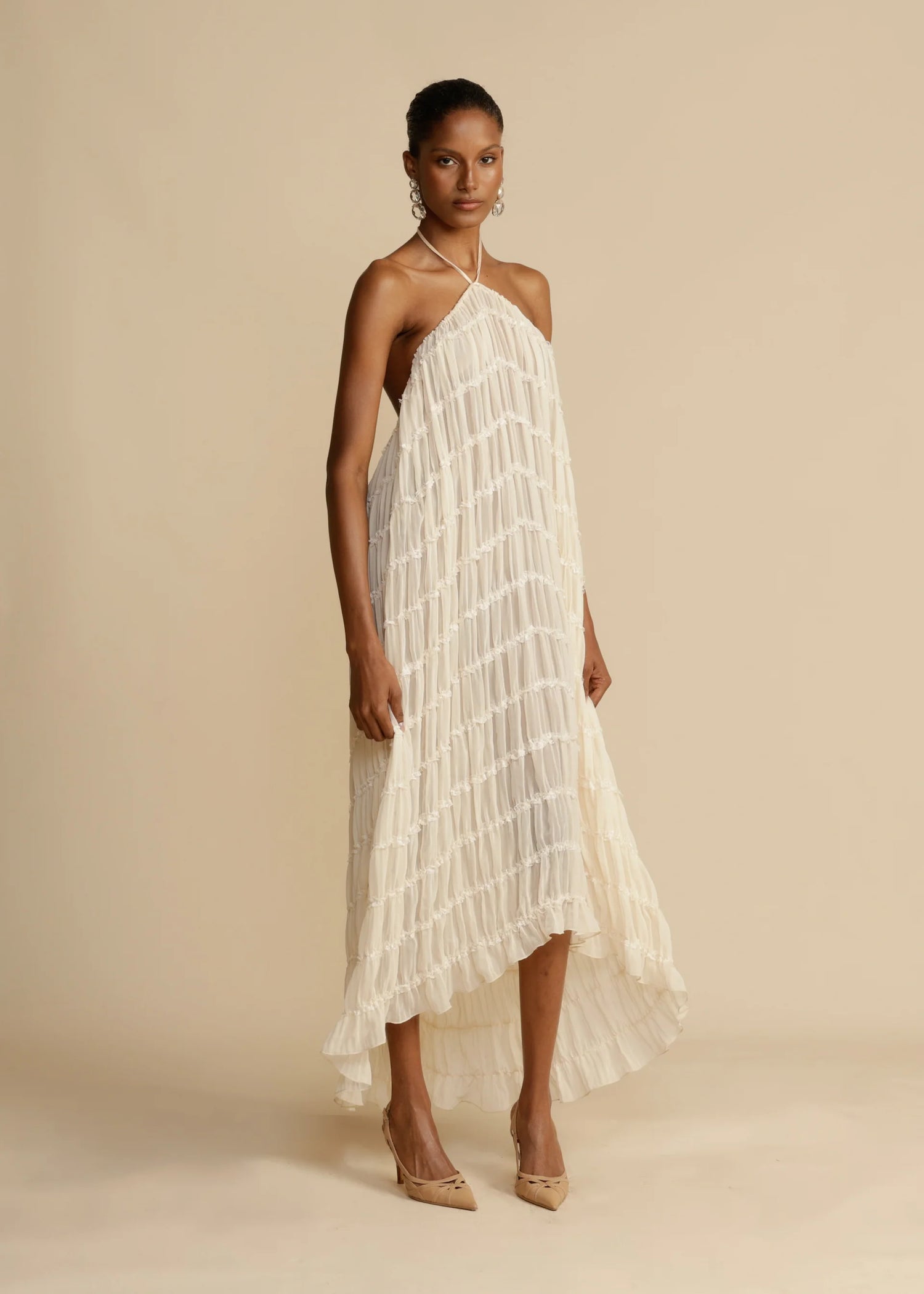 Crafted in a warm ivory tone, Juliette features a halter-style top and a voluminous sheer maxi skirt adorned with delicate ruching and piped lace trims. The top offers an adjustable neck tie and elasticated back straps for a flexible and flattering fit. The skirt is equally versatile – wear it high-waisted or transform it into a flowing maxi dress with a low, open back.